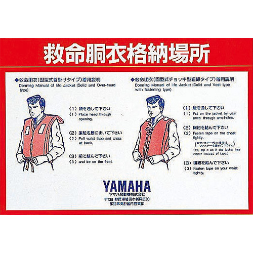 救命品・検査品 救命/船舶検査品類 メーカー: YAMAHA ライフジャケットステッカー 264円(税込) / 240(税抜) 税率:10% このステッカーは、救命胴衣の格納場所、及び使用方法を表示したものです。 船舶検査時(定期、中間等)には、船体への明示が必要となります。 購入先・在庫確認 ほしいものリストに追加