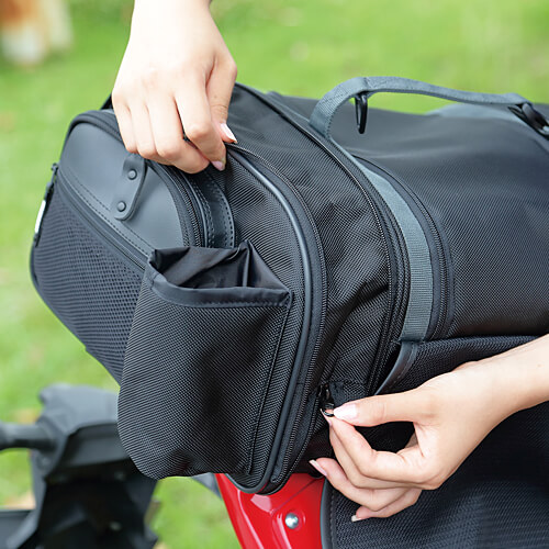 日帰りから2泊まで幅広く対応するシートバッグ。両サイド可変容量対応で、多少の追加積載もOK!ボトルホルダーを2つ装備。小物や車載工具なども収納可能。
