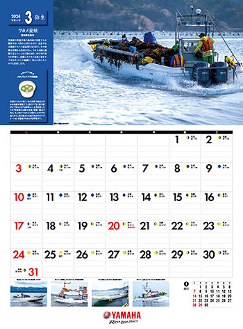 日本の沿岸漁業や養殖業で活躍する人々と、水産業に寄り添うヤマハ製品をテーマにした「大漁カレンダー」。普段目にすることのない漁業シーンの写真と、書き込みスペースを設けた実用性の高さが人気です。月ごとのおいしい魚介料理に関するコラムも好評です。