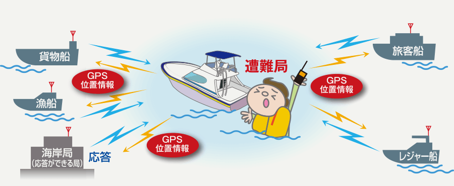 緊急時に遭難通報を発信することで、自船のGPS位置情報と遭難信号を周囲の船舶や海岸局に送信することができます。