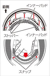 後側のインナーパッドは、スナップ(2ヶ所)を合わせ、「パチン」と音がするまで押さえ付けます。