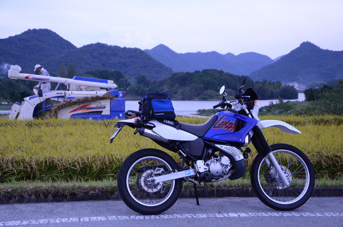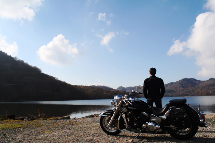 - ツーリング途中、秋の名栗湖をバックに