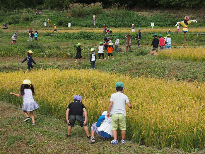 - 黄金色の稲穂の中で遊ぶ子供の情景が、実りの喜びを倍増しているようです。