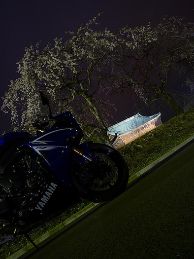 - 昼間は桜を見に行けず、夜桜です。