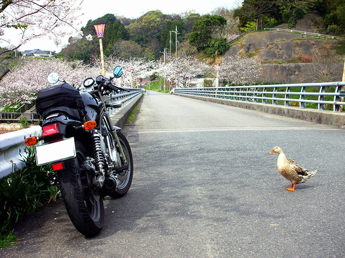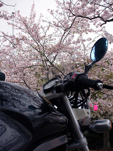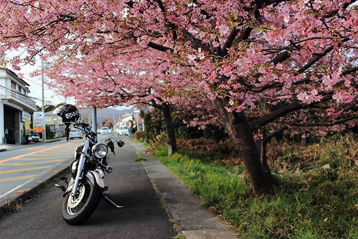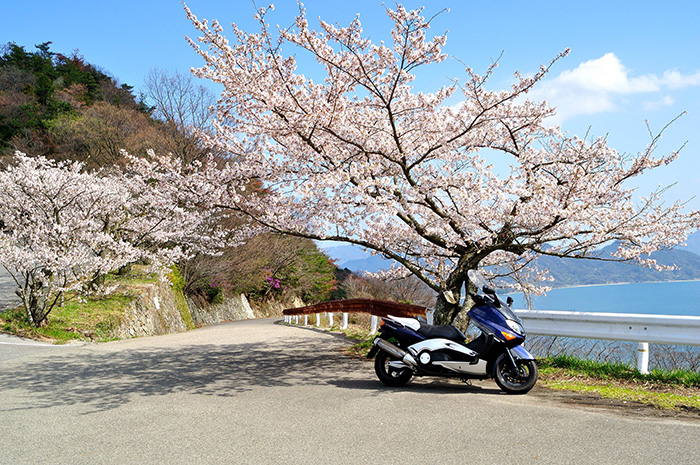 - 納車直後、嬉しくて海岸沿いの高台を走行中、桜吹雪舞うピンクの絨毯を見つけました。